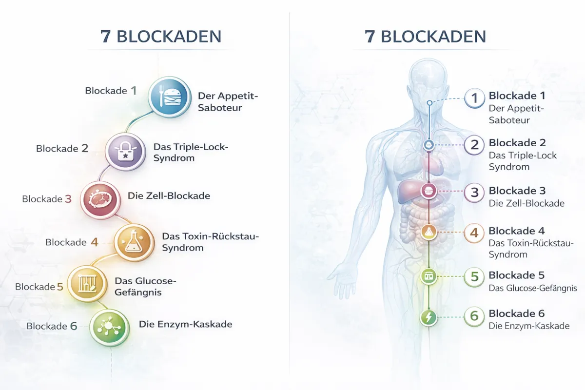 Option 1: Sie schließen diese Seite. Vielleicht versuchen Sie nächsten Monat eine neue Diät. Im Februar versuchen Sie Intervallfasten — ohne zu wissen, dass Ihre Blockade 1 es unmöglich macht. Im April probieren Sie Keto — aber Ihre Blockade 2 blockiert die Fettverbrennung. Im Dezember haben Sie €500 für Supplements ausgegeben, die Blockade 3 bis 7 nicht einmal adressieren.
