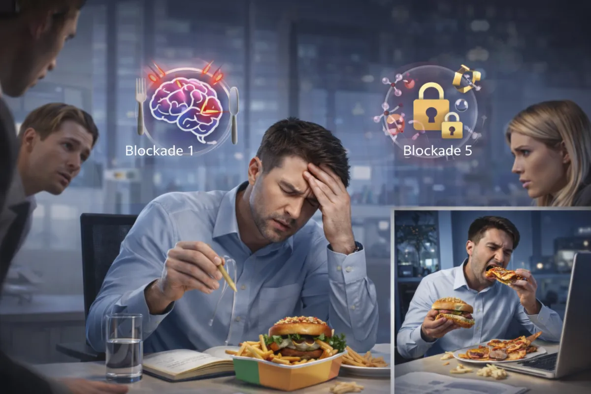 16 Stunden gefastet. Die ersten drei Tage fühlten sich gut an. Dann der vierte Tag. Das Zittern. Der Kopf, der nicht mehr funktioniert. Die Kollegen, die Sie fragen: „Alles okay?" Und abends haben Sie alles aufgeholt — plus extra. Warum? Weil Intervallfasten bei gestörten Sättigungssignalen (Blockade 1) oder blockiertem Glucose-Transport (Blockade 5) das Problem verschärft.