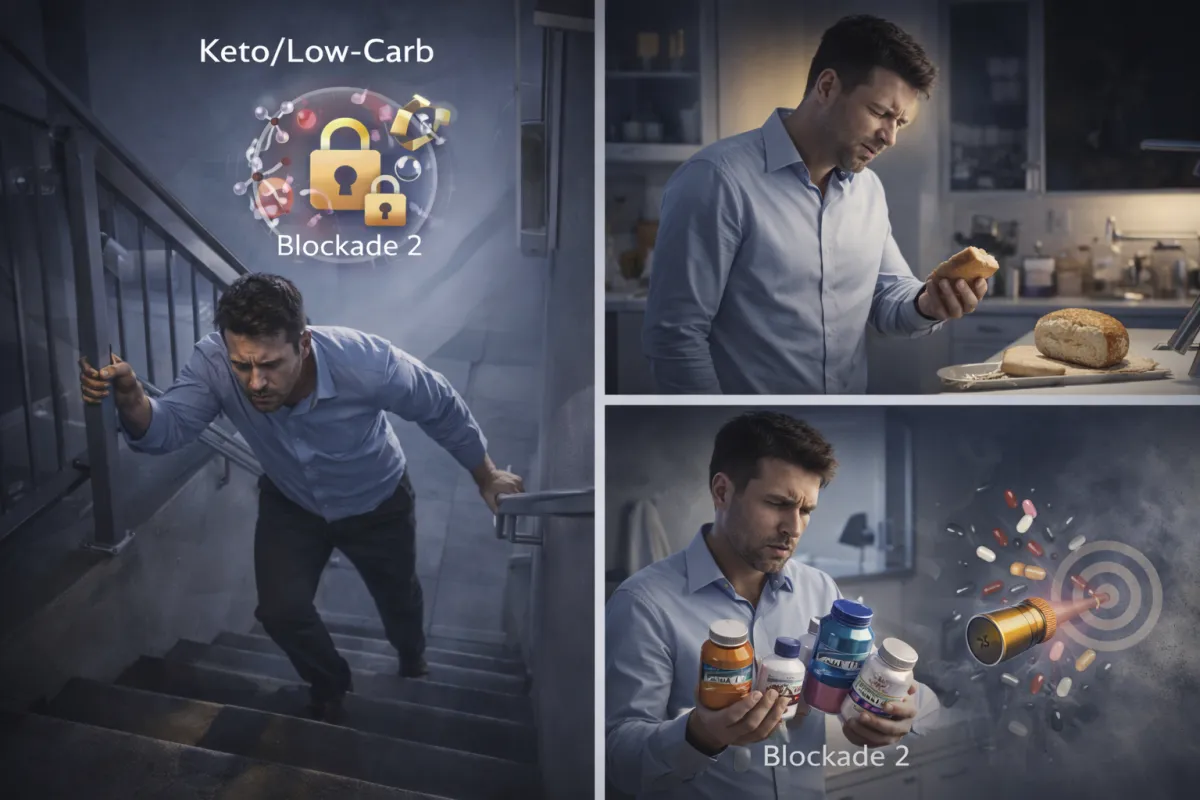 Die erste Woche: 2 Kilo runter. Die zweite Woche: Stillstand. Die dritte Woche: Erschöpfung so tief, dass Sie sich beim Treppensteigen am Geländer festhalten mussten. Der Moment, als Sie aufgegeben haben — allein in der Küche, mit einem Stück Brot in der Hand. Warum? Weil Keto nur funktioniert, wenn der metabolische Schalter (Blockade 2) noch funktionsfähig ist.