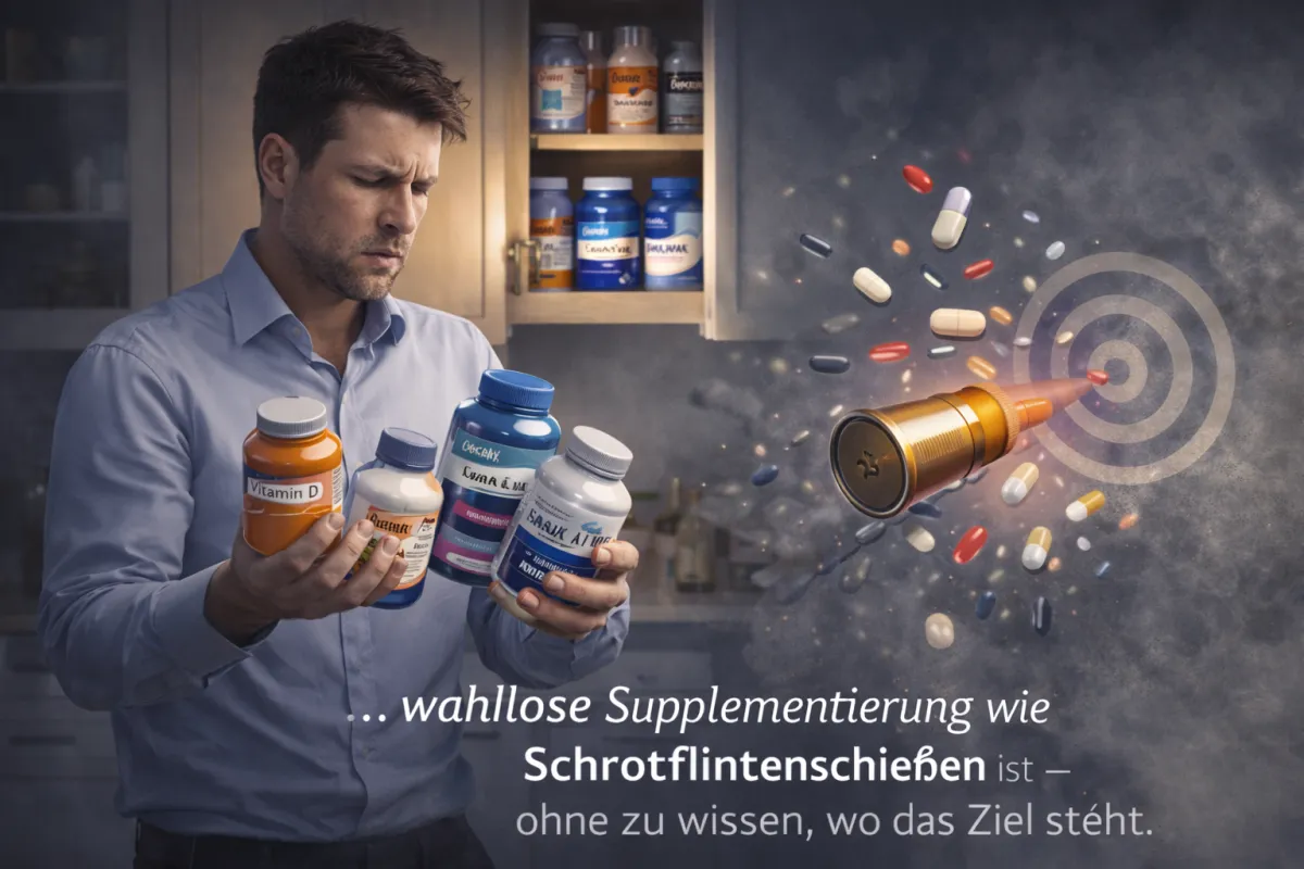 Die Packungen im Schrank. Vitamin D. Magnesium. Omega-3. Jeden Morgen geschluckt. Wochen. Monate. Nichts. Warum? Weil wahllose Supplementierung wie Schrotflintenschießen ist — ohne zu wissen, wo das Ziel steht.