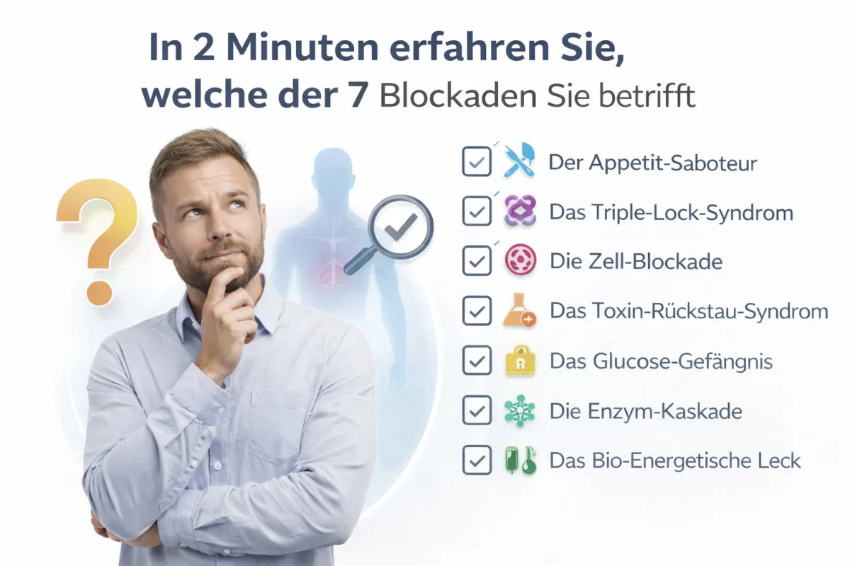 Option 2: Sie investieren 2 Minuten, um Klarheit zu bekommen. Sie erfahren, welche der 7 Blockaden bei Ihnen dominant ist. Und Sie bekommen einen Ansatz, der auf Ihrer individuellen Biologie basiert — nicht auf Marketing-Versprechen.